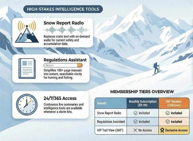 Full access to VIP content Live Snow Report and Summary 24/7/365 Live Snow Report Radio 24/7/365 Trail Maps Fishing and Hunting Regulations Assistant Coming Soon 360 degree trail view footage