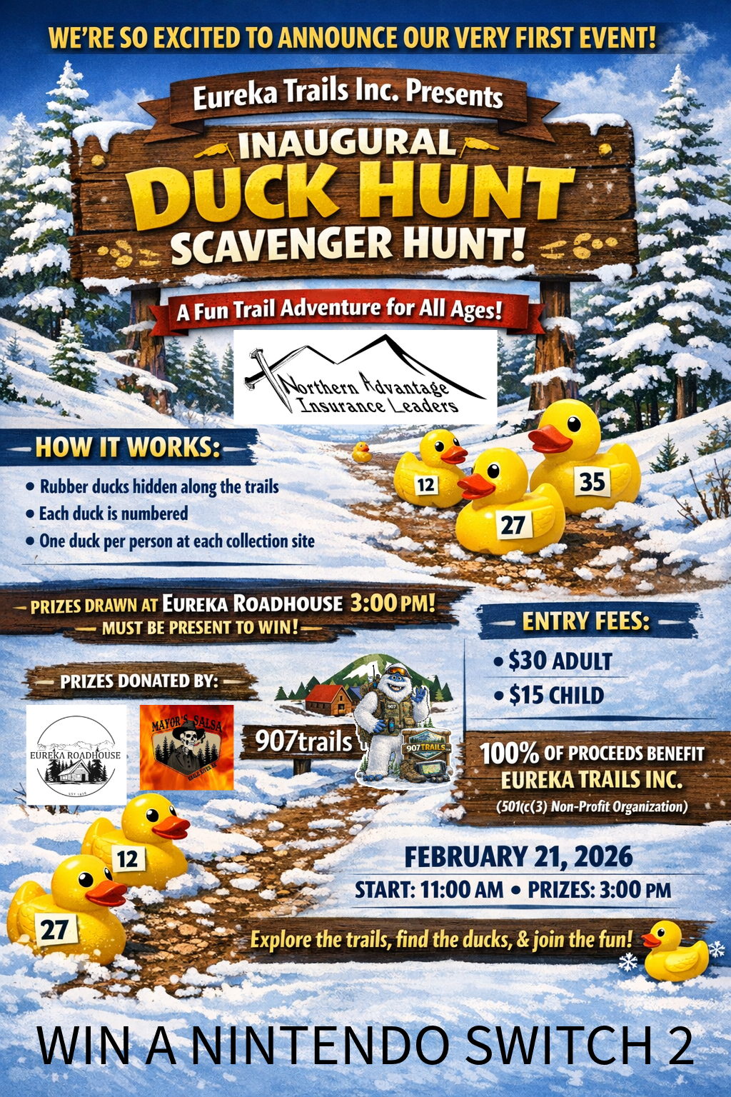 Eureka Trails Inc. is hosting our Inaugural Duck Hunt Scavenger Hunt! A fun, all-ages event that gets you out on the trails while supporting a great cause! Huge thank you to Northern Advantage Insurance Leaders, LLC- thank you for sponsoring this event!